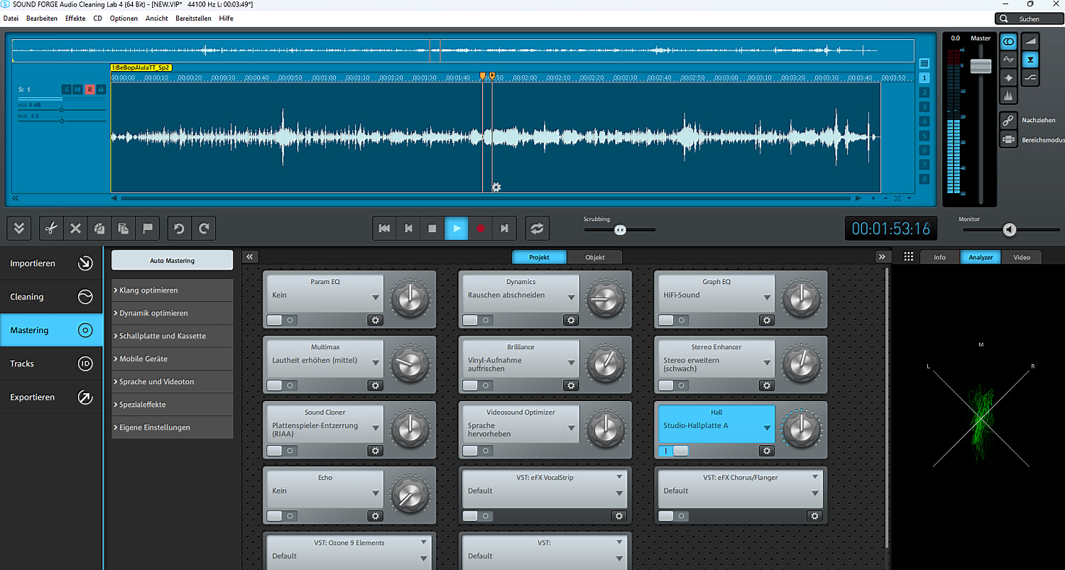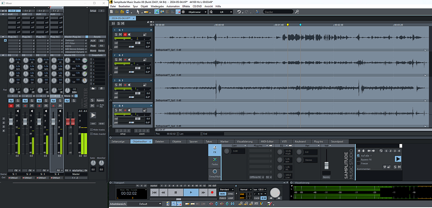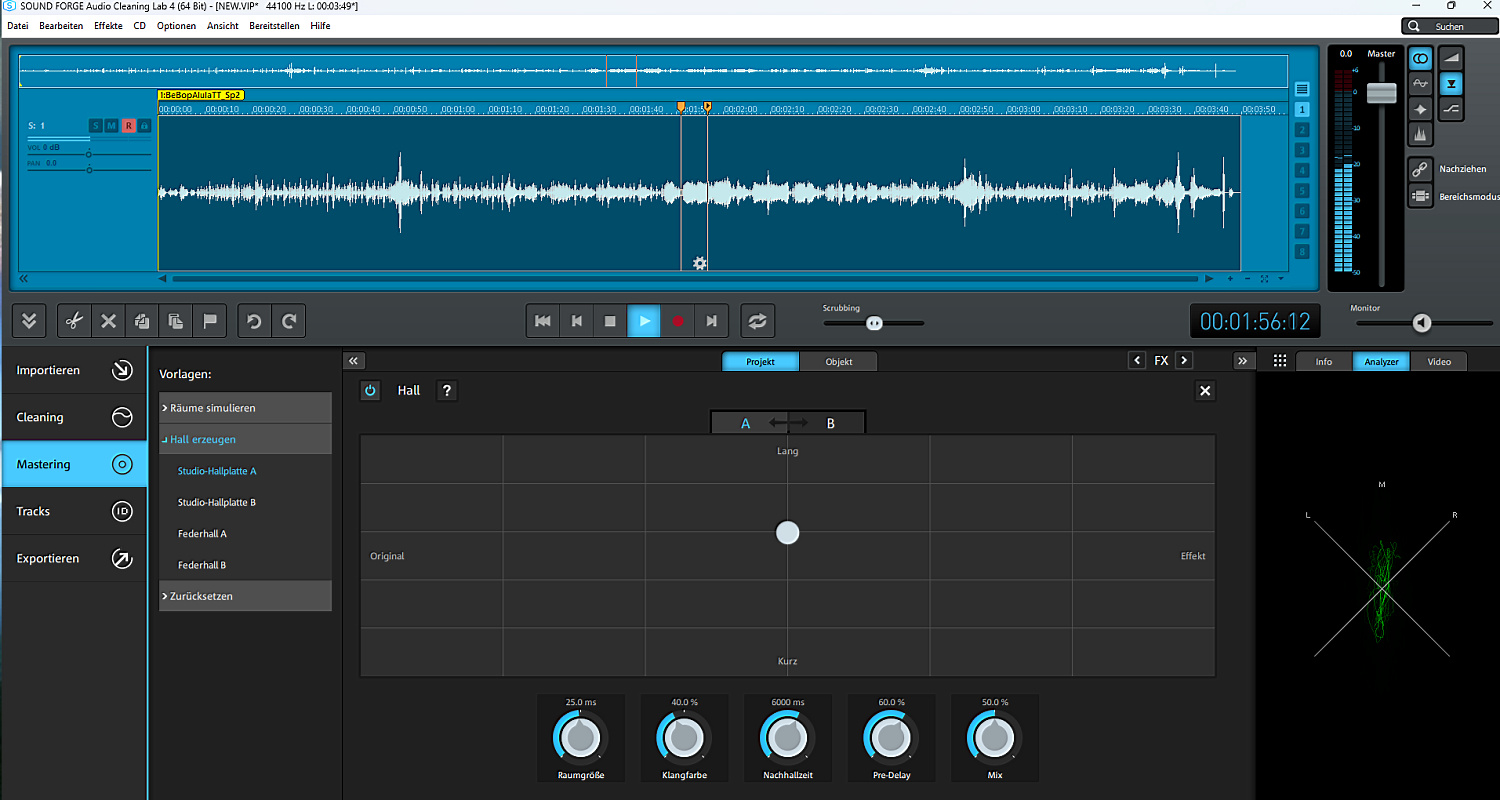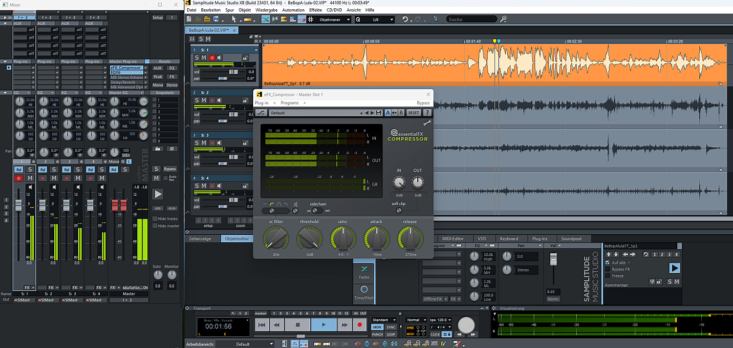 Jetzt kann man schon mal alle Spuren im Pegel prüfen, korrigieren und evtl. den KOMPRESSOR einsetzen. Danach ist auch schon für jede Spur einzeln eine Effektbearbeitung möglich. Sind alle Spuren bearbeitet und der Sound (einschl. Vocals) zufriedenstellend, kommt das eigentliche Mastering im ausgabefertigen 2-Spur-Stereo Bereich! (Mischpult etc.) Hier sind noch allerletzte Korrekturen möglich, wichtig ist z. B., kleine Übersteuerungen mittels eines Limiters zu verhindern. Im Stereobereich sollte auch mal die MonoTaste verwendet werden, um zu vermeiden, dass evtl. ein Instrument in den „unhörbaren“ seitlichen Bereich verschwindet!