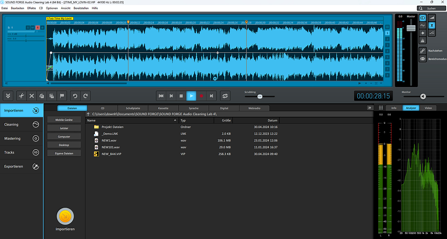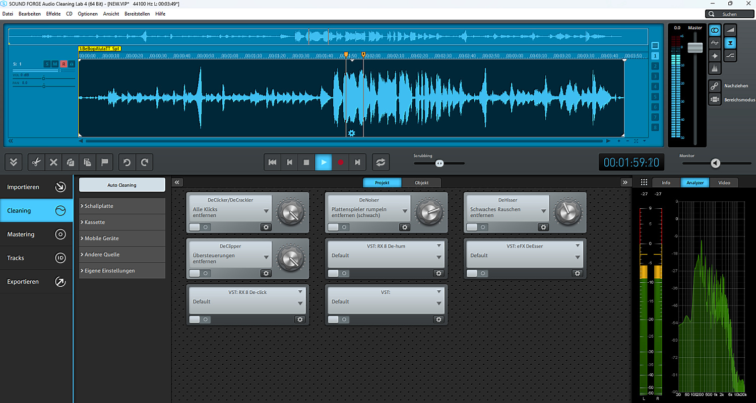 Das soll aber eigentlich alles noch etwas präziser bearbeitet werden, deshalb geht es ab jetzt um die „DIGITALVERSION“! Dafür ist es aber erforderlich, die erstellten Musiktitel auf den Tapes für den Computer zu überspielen (konvertieren)! Wie bisher, funktioniert das aber auch nur in Echtzeit, also 4 Min. Musik auf dem Band werden in dieser Zeit auf den PC kopiert! Dafür eignen sich div. Softwareprogramme, vorausgesetzt, man verbindet den Ausgang der Bandmaschine korrekt mit dem Computer! Hier im Beispiel wird die Software „SOUND FORGE AudioCleaningLab“ verwendet.