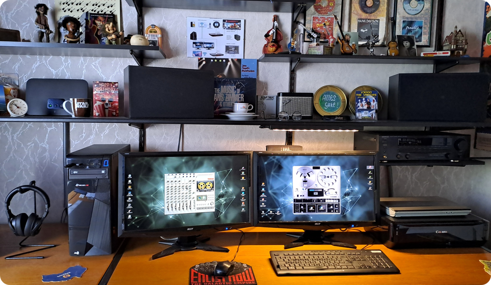 Musik hören und gute Titel in irgendeiner Form zu sammeln, war schon sehr lange mein Hobby. In den frühen 1960er Jahren waren das hauptsächlich Single-Schallplatten auch aus Musikboxen. Dazu gehörten dann einmal Dixieland Jazz (Chris Barber/Acker Bilk usw.) und besonders die Rock'n'Roll-Musik in jeder Form. Insbesondere von Elvis, Cliff Richard & The Shadows oder Chuck Berry sowie natürlich alle möglichen Instrumentalgruppen und Musiker wie Duane Eddy, The Ventures u.v.m. Gern hätte man sich damals schon sog. "Playlisten" in Form selbst zusammengestellter Songlisten erstellt. Aber die dafür benötigten Tonbandgeräte waren unerschwinglich teuer! Die Hersteller dieser "Tapes" haben aber bald auch erschwingliche Aufnahmegeräte in den Handel gebracht. Und somit stand dann irgendwann ein Philips-Vierspurgerät im damals noch ganz kleinen Homestudio. Mit dieser Bandmaschine konnte man schon reichlich Aufnahmen machen, leider waren die Steckerverbindungen (heute Schnittstellen) vielfältig und teilweise kompliziert. Die Mikrofonaufnahmen gestalteten sich auch als recht umständlich und kompliziert. Später kamen dann Mischpult und einfache Effektgeräte dazu.